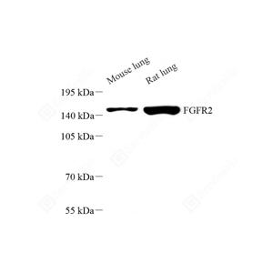 WB检测FGFR2蛋白(货号 GB115514). 样品: 经RIPA裂解液(货号G2002)处理的蛋白质. 封闭: 封闭: 3%脱脂牛奶(货号GC310001)溶于TBST溶液, 室温孵育1小时. —抗: 1: 300稀释, 4℃ 孵育过夜. 二抗: HRP标记山羊抗兔IgG (H+L) (货号GB23303), 1: 5000稀释, 室温孵育1小时. |