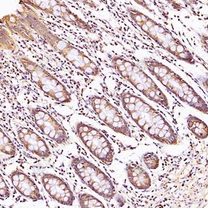 IHC检测HBEGF/DTR蛋白(货号 GB112926). 样品: 人结肠, 4%多聚甲醛 (货号G1101) 固定12-24小时. 抗原修复: 柠檬酸抗原修复液(干粉, pH 6.0) (G1201), 98℃, 20分钟. —抗: 1: 700稀释, 4℃ 孵育过夜. 二抗: HRP标记山羊抗兔IgG (H+L) (货号GB23303), 1: 200稀释, 室温孵育1小时. |