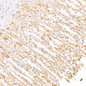 IHC检测HBEGF/DTR蛋白(货号 GB112926). 样品: 大鼠胃, 4%多聚甲醛 (货号G1101) 固定12-24小时. 抗原修复: 柠檬酸抗原修复液(干粉, pH 6.0) (G1201), 98℃, 20分钟. —抗: 1: 700稀释, 4℃ 孵育过夜. 二抗: HRP标记山羊抗兔IgG (H+L) (货号GB23303), 1: 200稀释, 室温孵育1小时. |