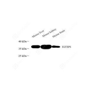 WB检测IGFBP6蛋白(货号 GB114043). 样品: 经RIPA裂解液(货号G2002)处理的蛋白质. 封闭: 封闭: 3%脱脂牛奶(货号GC310001)溶于TBST溶液, 室温孵育1小时. —抗: 1: 5000稀释, 4℃ 孵育过夜. 二抗: HRP标记山羊抗兔IgG (H+L) (货号GB23303), 1: 5000稀释, 室温孵育1小时. |