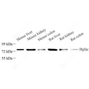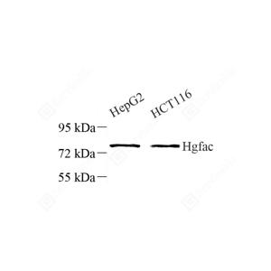 WB检测Hgfac蛋白(货号 GB113116). 样品: 经RIPA裂解液(货号G2002)处理的蛋白质. 封闭: 封闭: 3%脱脂牛奶(货号GC310001)溶于TBST溶液, 室温孵育1小时. —抗: 1: 2000稀释, 4℃ 孵育过夜. 二抗: HRP标记山羊抗兔IgG (H+L) (货号GB23303), 1: 5000稀释, 室温孵育1小时. |