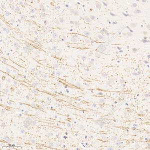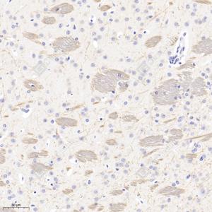 IHC检测FGF13蛋白(货号 GB113131). 样品: 小鼠纹状体, 4%多聚甲醛 (货号G1101) 固定12-24小时. 抗原修复: 柠檬酸抗原修复液(干粉, pH 6.0) (G1201), 98℃, 20分钟. —抗: 1: 2100稀释, 4℃ 孵育过夜. 二抗: HRP标记山羊抗兔IgG (H+L) (货号GB23303), 1: 200稀释, 室温孵育1小时. |