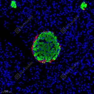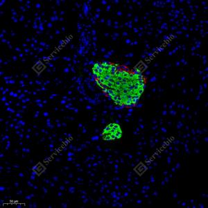 | IF检测Glucagon蛋白(货号 YB11108)(绿色). 样品: 小鼠胰腺, 4%多聚甲醛 (货号Y1112) 固定12-24小时. 抗原修复: Tris-EDTA抗原修复液(pH 9.0) (Y1214), 98℃, 20分钟. 封闭: 3% BSA(货号YC305021)的PBS溶液, 室温孵育30分钟. —抗: 1: 200稀释, 4℃ 孵育过夜. 二抗: Alexa Fluor 488标记山羊抗兔IgG (H+L) (货号YB25314), 1: 400稀释, 室温孵育1小时. |