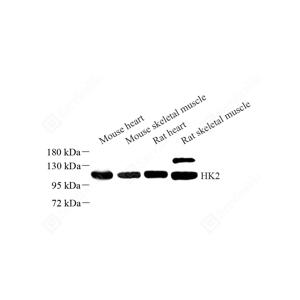 WB检测Hexokinase II蛋白(货号 YB11877). 样品: 经RIPA裂解液(货号Y2013)处理的蛋白质. 封闭: 封闭: 3%脱脂牛奶(货号YC310012)溶于TBST溶液, 室温孵育1小时. —抗: 1: 500稀释, 4℃ 孵育过夜. 二抗: HRP标记山羊抗兔IgG (H+L) (货号YB23314), 1: 5000稀释, 室温孵育1小时. |