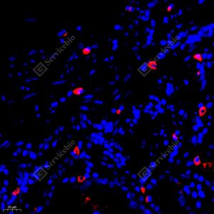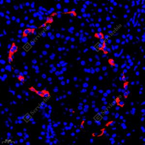 IF检测GLP1蛋白(货号 YB11346)(红色). 样品: 大鼠胰腺, 4%多聚甲醛 (货号Y1112) 固定12-24小时. 抗原修复: Tris-EDTA抗原修复液(pH 9.0) (Y1214), 98℃, 20分钟. 封闭: 3% BSA(货号YC305021)的PBS溶液, 室温孵育30分钟. —抗: 1: 500稀释, 4℃ 孵育过夜. 二抗: Cy3标记山羊抗兔IgG (H+L) (货号YB21314), 1: 300稀释, 室温孵育1小时. |