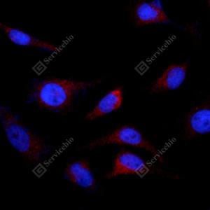 ICC检测PDHA1蛋白(货号 YB112520)(红色). 样品: Hela细胞, 4%多聚甲醛 (货号Y1112) 固定20分钟. 封闭: 3% BSA(货号YC305021)的PBS溶液, 室温孵育30分钟. 一抗: 1: 200稀释, 4℃ 孵育过夜. 二抗: Cy3标记山羊抗兔IgG (H+L) (货号YB21314), 1: 300稀释, 室温孵育1小时. |