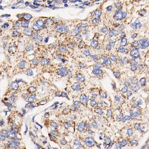 IHC检测GLUD1蛋白(货号 YB113844). 样品: 人肺癌, 4%多聚甲醛 (货号Y1112) 固定12-24小时. 抗原修复: 柠檬酸抗原修复液(干粉, pH 6.0) (Y1212), 98℃, 20分钟. —抗: 1: 800稀释, 4℃ 孵育过夜. 二抗: HRP标记山羊抗兔IgG (H+L) (货号YB23314), 1: 200稀释, 室温孵育1小时. |