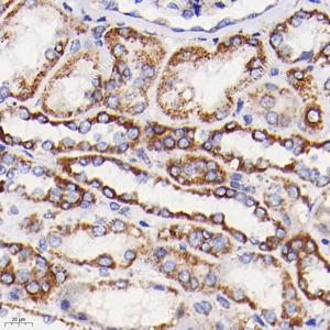 IHC检测GLUD1蛋白(货号 YB113844). 样品: 人肾, 4%多聚甲醛 (货号Y1112) 固定12-24小时. 抗原修复: 柠檬酸抗原修复液(干粉, pH 6.0) (Y1212), 98℃, 20分钟. —抗: 1: 800稀释, 4℃ 孵育过夜. 二抗: HRP标记山羊抗兔IgG (H+L) (货号YB23314), 1: 200稀释, 室温孵育1小时. |