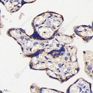 IHC检测GLUD1蛋白(货号 YB113844). 样品: 人胎盘, 4%多聚甲醛 (货号Y1112) 固定12-24小时. 抗原修复: 柠檬酸抗原修复液(干粉, pH 6.0) (Y1212), 98℃, 20分钟. —抗: 1: 800稀释, 4℃ 孵育过夜. 二抗: HRP标记山羊抗兔IgG (H+L) (货号YB23314), 1: 200稀释, 室温孵育1小时. |