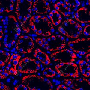 IF检测GLUD1蛋白(货号 YB113844)(红色). 样品: 人肾, 4%多聚甲醛 (货号Y1112) 固定12-24小时. 抗原修复: Tris-EDTA抗原修复液(pH 9.0) (Y1214), 98℃, 20分钟. 封闭: 3% BSA(货号YC305021)的PBS溶液, 室温孵育30分钟. —抗: 1: 400稀释, 4℃ 孵育过夜. 二抗: Cy3标记山羊抗兔IgG (H+L) (货号YB21314), 1: 300稀释, 室温孵育1小时. |