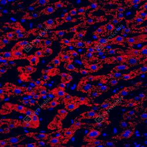 IF检测GLUD1蛋白(货号 YB113844)(红色). 样品: 人肝癌, 4%多聚甲醛 (货号Y1112) 固定12-24小时. 抗原修复: Tris-EDTA抗原修复液(pH 9.0) (Y1214), 98℃, 20分钟. 封闭: 3% BSA(货号YC305021)的PBS溶液, 室温孵育30分钟. —抗: 1: 400稀释, 4℃ 孵育过夜. 二抗: Cy3标记山羊抗兔IgG (H+L) (货号YB21314), 1: 300稀释, 室温孵育1小时. |