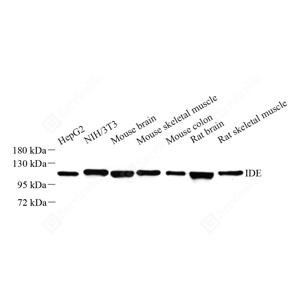 WB检测Insulin degrading enzyme/IDE蛋白(货号 YB111398). 样品: 经RIPA裂解液(货号Y2013)处理的蛋白质. 封闭: 封闭: 3%脱脂牛奶(货号YC310012)溶于TBST溶液, 室温孵育1小时. —抗: 1: 500稀释, 4℃ 孵育过夜. 二抗: HRP标记山羊抗兔IgG (H+L) (货号YB23314), 1: 5000稀释, 室温孵育1小时. |