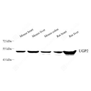 UDP-glucose pyrophosphorylase 2 (UGP2, synonyms: UDPG, UGPP2, UDPGP2, Phc379)is an important intermediary in mammalian carbohydrate interconversions. It transfers a glucose moiety from glucose-1-phosphate to MgUTP and forms UDP-glucose and MgPPi. In liver and muscle tissue, UDP-glucose is a direct precursor of glycogen; in lactating mammary gland it is converted to UDP-galactose which is then converted to lactose. So far two isoforms are encoded by two transcript variants have been found.