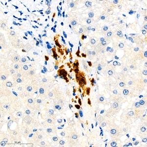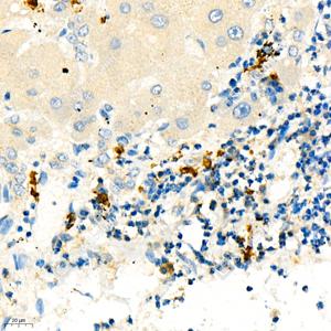 IHC检测PFKL蛋白(货号 YB111147). 样品: 人肝, 4%多聚甲醛 (货号Y1112) 固定12-24小时. 抗原修复: 柠檬酸抗原修复液(干粉, pH 6.0) (Y1212), 98℃, 20分钟. —抗: 1: 1600稀释, 4℃ 孵育过夜. 二抗: HRP标记山羊抗兔IgG (H+L) (货号YB23314), 1: 200稀释, 室温孵育1小时. |