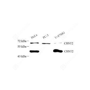 CHST2 encodes N-Acetylglucosamine-6-sulfotransferase-1 (GlcNAc6ST-1), a Golgi-resident glycoprotein that is responsible for sulfation of the L-selectin ligand on endothelial cells. Two isoforms of CHST2 exist due to the alternative splicing. This antibody recognizes both short form and long form, which migrates around 50-52 kDa and 58-60 kDa, respectively.