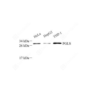 WB检测PGLS蛋白(货号 YB112157). 样品: 经RIPA裂解液(货号Y2013)处理的蛋白质. 封闭: 封闭: 3%脱脂牛奶(货号YC310012)溶于TBST溶液, 室温孵育1小时. —抗: 1: 500稀释, 4℃ 孵育过夜. 二抗: HRP标记山羊抗兔IgG (H+L) (货号YB23314), 1: 5000稀释, 室温孵育1小时. |