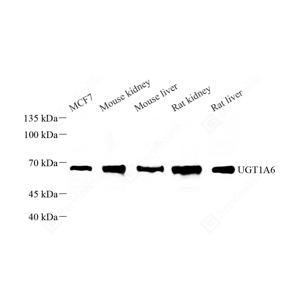 WB检测UGT1A6蛋白(货号 YB115688). 样品: 经RIPA裂解液(货号Y2013)处理的蛋白质. 封闭: 3%脱脂牛奶(货号YC310012)溶于TBST溶液, 室温孵育1小时. —抗: 1: 1000稀释, 4℃ 孵育过夜. 二抗: HRP标记山羊抗兔IgG (H+L) (货号YB23314), 1: 5000稀释, 室温孵育1小时. |