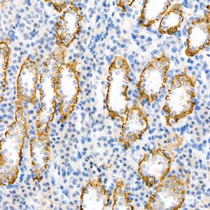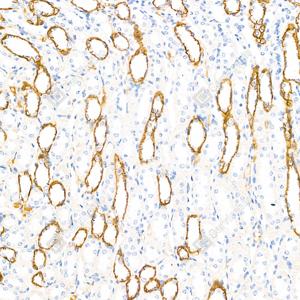 IHC检测Aquaporin 3蛋白(货号 YB12544). 样品: 大鼠肾, 4%多聚甲醛 (货号Y1112) 固定12-24小时. 抗原修复: 柠檬酸抗原修复液(干粉, pH 6.0) (Y1212), 高压锅均匀喷气计时2分钟. —抗: 1: 2000稀释, 4℃ 孵育过夜. 二抗: HRP标记山羊抗小鼠IgG (H+L) (货号YB23312), 1: 200稀释, 室温孵育1小时. |