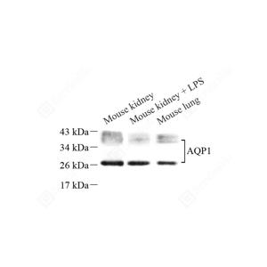 WB检测Aquaporin 1蛋白(货号 YB11321-1). 样品: 经RIPA裂解液(货号Y2013)处理的蛋白质. 封闭: 3%脱脂牛奶(货号YC310012)溶于TBST溶液, 室温孵育1小时. —抗: 1: 2000稀释, 4℃ 孵育过夜. 二抗: HRP标记山羊抗兔IgG (H+L) (货号YB23314), 1: 5000稀释, 室温孵育1小时. |