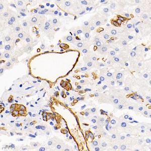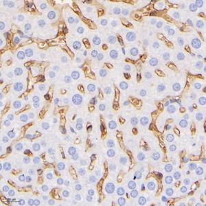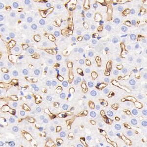IHC检测Aquaporin 1蛋白(货号 YB11321-1). 样品: 小鼠肝, 4%多聚甲醛 (货号Y1112) 固定12-24小时. 抗原修复: 柠檬酸抗原修复液(干粉, pH 6.0) (Y1212), 98℃, 20分钟. —抗: 1: 900稀释, 4℃ 孵育过夜. 二抗: HRP标记山羊抗兔IgG (H+L) (货号YB23314), 1: 200稀释, 室温孵育1小时. |