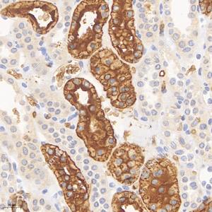 IHC检测Aquaporin 1蛋白(货号 YB11321-1). 样品: 人肾, 4%多聚甲醛 (货号Y1112) 固定12-24小时. 抗原修复: 柠檬酸抗原修复液(干粉, pH 6.0) (Y1212), 98℃, 20分钟. —抗: 1: 900稀释, 4℃ 孵育过夜. 二抗: HRP标记山羊抗兔IgG (H+L) (货号YB23314), 1: 200稀释, 室温孵育1小时. |