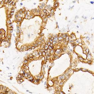 IHC检测Aquaporin 1蛋白(货号 YB11321-1). 样品: 人结肠癌, 4%多聚甲醛 (货号Y1112) 固定12-24小时. 抗原修复: 柠檬酸抗原修复液(干粉, pH 6.0) (Y1212), 98℃, 20分钟. —抗: 1: 900稀释, 4℃ 孵育过夜. 二抗: HRP标记山羊抗兔IgG (H+L) (货号YB23314), 1: 200稀释, 室温孵育1小时. |