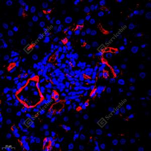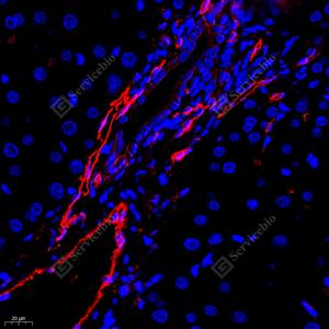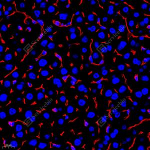 IF检测Aquaporin 1蛋白(货号 YB11321-1)(红色). 样品: 小鼠肝, 4%多聚甲醛 (货号Y1112) 固定12-24小时. 抗原修复: Tris-EDTA抗原修复液(pH 9.0) (Y1214), 98℃, 20分钟. 封闭: 3% BSA(货号YC305021)的PBS溶液, 室温孵育30分钟. —抗: 1: 500稀释, 4℃ 孵育过夜. 二抗: Cy3标记山羊抗兔IgG (H+L) (货号YB21314), 1: 300稀释, 室温孵育1小时. |