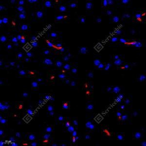 IF检测Aquaporin 1蛋白(货号 YB11321-1)(红色). 样品: 小鼠脑, 4%多聚甲醛 (货号Y1112) 固定12-24小时. 抗原修复: Tris-EDTA抗原修复液(pH 9.0) (Y1214), 98℃, 20分钟. 封闭: 3% BSA(货号YC305021)的PBS溶液, 室温孵育30分钟. —抗: 1: 500稀释, 4℃ 孵育过夜. 二抗: Cy3标记山羊抗兔IgG (H+L) (货号YB21314), 1: 300稀释, 室温孵育1小时. |