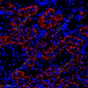 IF检测RST蛋白(货号 YB111858)(红色). 样品: 大鼠肾, 4%多聚甲醛 (货号Y1112) 固定12-24小时. 抗原修复: Tris-EDTA抗原修复液(pH 9.0) (Y1214), 98℃, 20分钟. 封闭: 3% BSA(货号YC305021)的PBS溶液, 室温孵育30分钟. —抗: 1: 2000稀释, 4℃ 孵育过夜. 二抗: Cy3标记山羊抗兔IgG (H+L) (货号YB21314), 1: 300稀释, 室温孵育1小时. |