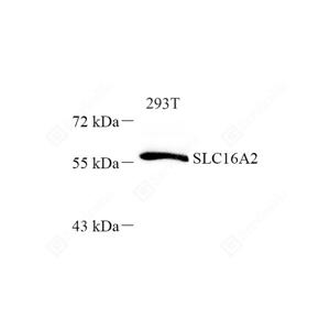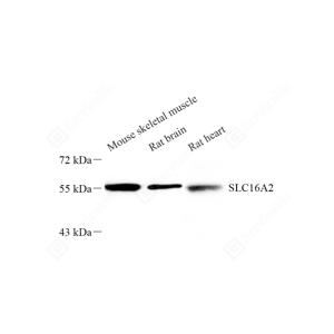 WB检测MCT 8蛋白(货号 YB112463). 样品: 经RIPA裂解液(货号Y2013)处理的蛋白质. 封闭: 封闭: 3%脱脂牛奶(货号YC310012)溶于TBST溶液, 室温孵育1小时. —抗: 1: 500稀释, 4℃ 孵育过夜. 二抗: HRP标记山羊抗兔IgG (H+L) (货号YB23314), 1: 5000稀释, 室温孵育1小时. |