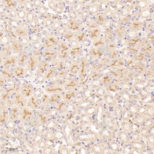 IHC检测ANO6蛋白(货号 YB115246). 样品: 小鼠肾, 4%多聚甲醛 (货号Y1112) 固定12-24小时. 抗原修复: Tris-EDTA抗原修复液(pH 9.0) (Y1214), 98℃, 20分钟. —抗: 1: 700稀释, 4℃ 孵育过夜. 二抗: HRP标记山羊抗兔IgG (H+L) (货号YB23314), 1: 200稀释, 室温孵育1小时. |