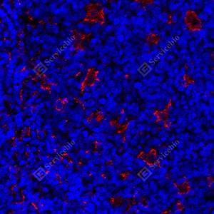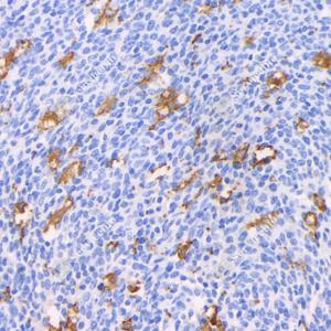 IHC检测Iba1蛋白(货号 GB15105). 样品: 人扁桃体, 4%多聚甲醛 (货号G1101) 固定12-24小时. 抗原修复: Tris-EDTA抗原修复液(pH 9.0) (G1203), 98℃, 20分钟. —抗: 1: 1000稀释, 4℃ 孵育过夜. 二抗: HRP标记山羊抗小鼠IgG (H+L) (货号GB23301), 1: 200稀释, 室温孵育1小时. |