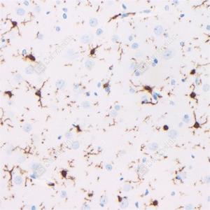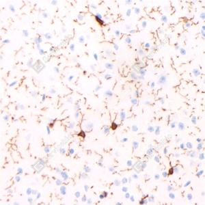 IHC检测Iba1蛋白(货号 GB15105). 样品: 猴脑, 4%多聚甲醛 (货号G1101) 固定12-24小时. 抗原修复: Tris-EDTA抗原修复液(pH 9.0) (G1203), 98℃, 20分钟. —抗: 1: 500稀释, 4℃ 孵育过夜. 二抗: HRP标记山羊抗小鼠IgG (H+L) (货号GB23301), 1: 200稀释, 室温孵育1小时. |
