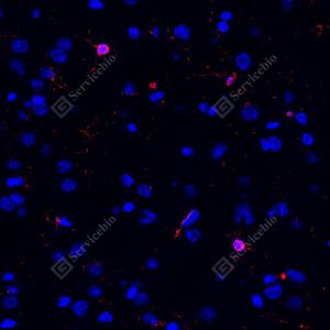 IF检测Iba1蛋白(货号 GB15105)(红色). 样品: 小鼠脑, 4%多聚甲醛 (货号G1101) 固定12-24小时. 抗原修复: Tris-EDTA抗原修复液(pH 9.0) (G1203), 98℃, 20分钟. 封闭: 3% BSA(货号GC305010)的PBS溶液, 室温孵育30分钟. —抗: 1: 500稀释, 4℃ 孵育过夜. 二抗: Cy3标记山羊抗小鼠IgG (H+L) (货号GB21301), 1: 300稀释, 室温孵育1小时. |