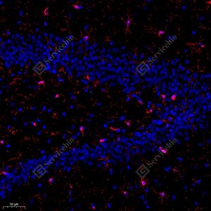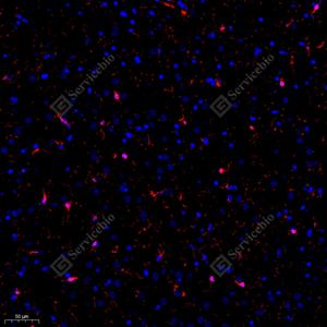 IF检测Iba1蛋白(货号 GB11105)(红色). 样品: 小鼠脑, 4%多聚甲醛 (货号G1101) 固定12-24小时. 抗原修复: Tris-EDTA抗原修复液(pH 9.0) (G1203), 98℃, 20分钟. 封闭: 3% BSA(货号GC305010)的PBS溶液, 室温孵育30分钟. —抗: 1: 500稀释, 4℃ 孵育过夜. 二抗: Cy3标记山羊抗兔IgG (H+L) (货号GB21303), 1: 300稀释, 室温孵育1小时. |