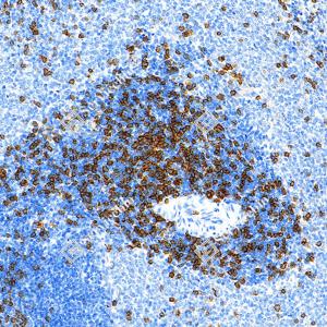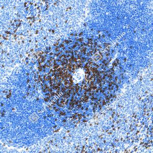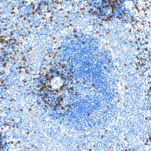 | IHC检测CD8 alpha蛋白(货号 GB155692). 样品: 大鼠脾, 4%多聚甲醛 (货号G1101) 固定12-24小时. 抗原修复: Tris-EDTA抗原修复液(pH 9.0) (G1203), 100℃, 25分钟. —抗: 1: 1000稀释, 4℃ 孵育过夜. 二抗: S-vision免疫组化多聚二抗(山羊抗兔),即用型 (货号G1302), 室温孵育20分钟. |