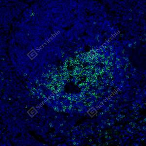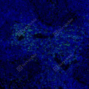 | IF检测CD8 alpha蛋白(货号 GB155692)(红色). 样品: 大鼠脾, 4%多聚甲醛 (货号G1101) 固定12-24小时. 抗原修复: Tris-EDTA抗原修复液(pH 9.0) (G1203), 100℃, 25分钟. 封闭: 3% BSA(货号GC305010)的PBS溶液, 室温孵育30分钟. —抗: 1: 1000稀释, 4℃ 孵育过夜. 二抗: Cy3标记山羊抗兔IgG (H+L) (货号GB21303), 1: 300稀释, 室温孵育1小时. |