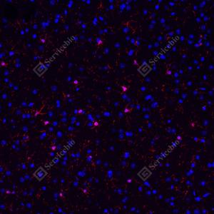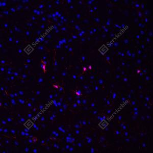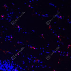 IF检测Iba1蛋白(货号 GB113502)(红色). 样品: 小鼠脑, 4%多聚甲醛 (货号G1101) 固定12-24小时. 抗原修复: Tris-EDTA抗原修复液(pH 9.0) (G1203), 98℃, 20分钟. 封闭: 3% BSA(货号GC305010)的PBS溶液, 室温孵育30分钟. —抗: 1: 500稀释, 4℃ 孵育过夜. 二抗: Cy3标记山羊抗兔IgG (H+L) (货号GB21303), 1: 300稀释, 室温孵育1小时. |