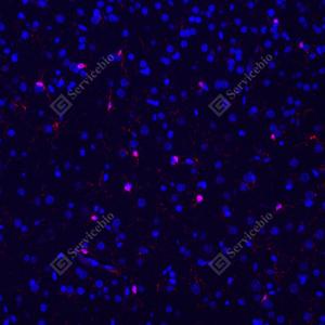 IF检测Iba1蛋白(货号 GB113502)(红色). 样品: 大鼠脑, 4%多聚甲醛 (货号G1101) 固定12-24小时. 抗原修复: Tris-EDTA抗原修复液(pH 9.0) (G1203), 98℃, 20分钟. 封闭: 3% BSA(货号GC305010)的PBS溶液, 室温孵育30分钟. —抗: 1: 500稀释, 4℃ 孵育过夜. 二抗: Cy3标记山羊抗兔IgG (H+L) (货号GB21303), 1: 300稀释, 室温孵育1小时. |