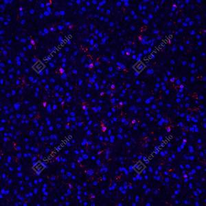 IF检测Iba1蛋白(货号 GB113502)(红色). 样品: 人少突胶质细胞瘤, 4%多聚甲醛 (货号G1101) 固定12-24小时. 抗原修复: Tris-EDTA抗原修复液(pH 9.0) (G1203), 98℃, 20分钟. 封闭: 3% BSA(货号GC305010)的PBS溶液, 室温孵育30分钟. —抗: 1: 500稀释, 4℃ 孵育过夜. 二抗: Cy3标记山羊抗兔IgG (H+L) (货号GB21303), 1: 300稀释, 室温孵育1小时. |