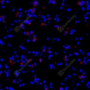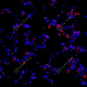 IF检测IL-1 beta蛋白(货号 GB11113)(红色). 样品: 小鼠肺炎(LPS), 4%多聚甲醛 (货号G1101) 固定12-24小时. 抗原修复: Tris-EDTA抗原修复液(pH 9.0) (G1203), 98℃, 20分钟. 封闭: 3% BSA(货号GC305010)的PBS溶液, 室温孵育30分钟. —抗: 1: 800稀释, 4℃ 孵育过夜. 二抗: Cy3标记山羊抗兔IgG (H+L) (货号GB21303), 1: 300稀释, 室温孵育1小时. |