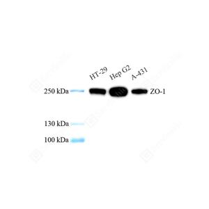 WB检测ZO1 tight junction protein蛋白(货号 GB121402). 样品: 经RIPA裂解液(货号G2002)处理的蛋白质. 封闭: 3%脱脂牛奶(货号GC310001)溶于TBST溶液, 室温孵育1小时. —抗: 1: 1000稀释, 4℃ 孵育过夜. 二抗: HRP标记山羊抗大鼠IgG (H+L) (货号GB23302), 1: 5000稀释, 室温孵育1小时. |