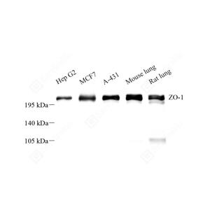 WB检测ZO1 tight junction protein蛋白(货号 GB115686). 样品: 经RIPA裂解液(货号G2002)处理的蛋白质. 封闭: 3%脱脂牛奶(货号GC310001)溶于TBST溶液, 室温孵育1小时. —抗: 1: 500稀释, 4℃ 孵育过夜. 二抗: HRP标记山羊抗兔IgG (H+L) (货号GB23303), 1: 5000稀释, 室温孵育1小时. |