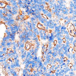 IHC检测ZO1 tight junction protein蛋白(货号 GB115686). 样品: 人结肠癌, 4%多聚甲醛 (货号G1101) 固定12-24小时. 抗原修复: Tris-EDTA抗原修复液(pH 9.0) (货号G1218), 高压锅均匀喷气计时2分钟. —抗: 1: 1500稀释, 4℃ 孵育过夜. 二抗: HRP标记山羊抗兔IgG (H+L) (货号GB23303), 1: 200稀释, 室温孵育1小时. |