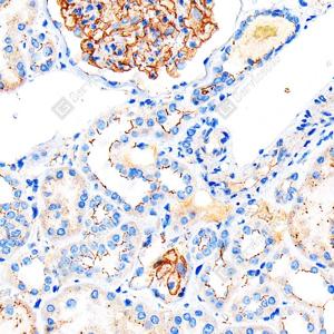 IHC检测ZO1 tight junction protein蛋白(货号 GB115686). 样品: 人肾, 4%多聚甲醛 (货号G1101) 固定12-24小时. 抗原修复: Tris-EDTA抗原修复液(pH 9.0) (货号G1218), 高压锅均匀喷气计时2分钟. —抗: 1: 1500稀释, 4℃ 孵育过夜. 二抗: HRP标记山羊抗兔IgG (H+L) (货号GB23303), 1: 200稀释, 室温孵育1小时. |