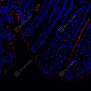 IF检测ZO1 tight junction protein蛋白(货号 GB121981)(红色). 样品: 人结肠, 4%多聚甲醛 (货号G1101) 固定12-24小时. 抗原修复: Tris-EDTA抗原修复液(pH 9.0) (货号G1218), 高压锅均匀喷气计时2分钟. 封闭: 3% BSA(货号GC305010)的PBS溶液, 室温孵育30分钟. —抗: 1: 1000稀释, 4℃ 孵育过夜. 二抗: Cy3标记山羊抗小鼠IgG (H+L) (货号GB21301), 1: 300稀释, 室温孵育1小时. |