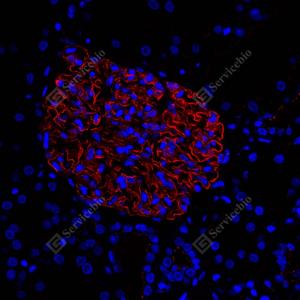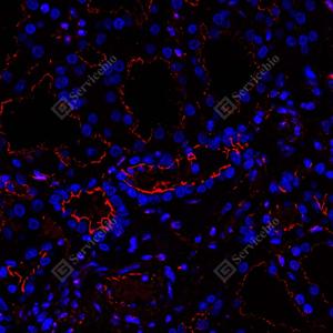 IF检测ZO1 tight junction protein蛋白(货号 GB121981)(红色). 样品: 人肾, 4%多聚甲醛 (货号G1101) 固定12-24小时. 抗原修复: Tris-EDTA抗原修复液(pH 9.0) (货号G1218), 高压锅均匀喷气计时2分钟. 封闭: 3% BSA(货号GC305010)的PBS溶液, 室温孵育30分钟. —抗: 1: 1000稀释, 4℃ 孵育过夜. 二抗: Cy3标记山羊抗小鼠IgG (H+L) (货号GB21301), 1: 300稀释, 室温孵育1小时. |