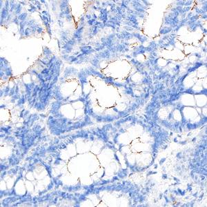 IHC检测ZO1 tight junction protein蛋白(货号 GB121981). 样品: 人结肠癌, 4%多聚甲醛 (货号G1101) 固定12-24小时. 抗原修复: Tris-EDTA抗原修复液(pH 9.0) (货号G1218), 高压锅均匀喷气计时2分钟. —抗: 1: 1000稀释, 4℃ 孵育过夜. 二抗: S-vision免疫组化多聚二抗(山羊抗小鼠), 即用型(货号G1301), 室温孵育20分钟. |