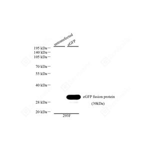 WB检测EGFP蛋白(货号 GB15603). 样品: 经RIPA裂解液(货号G2002)处理的蛋白质. 封闭: 3%脱脂牛奶(货号GC310001)溶于TBST溶液, 室温孵育1小时. —抗: 1: 1000稀释, 4℃ 孵育过夜. 二抗: HRP标记山羊抗兔IgG (H+L) (货号GB23303), 1: 5000稀释, 室温孵育1小时. |