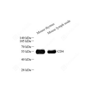 WB检测CD4蛋白(货号 GB15064). 样品: 经RIPA裂解液(货号G2002)处理的蛋白质. 封闭: 3%脱脂牛奶(货号GC310001)溶于TBST溶液, 室温孵育1小时. —抗: 1: 500稀释, 4℃ 孵育过夜. 二抗: HRP标记山羊抗兔IgG (H+L) (货号GB23303), 1: 5000稀释, 室温孵育1小时. |